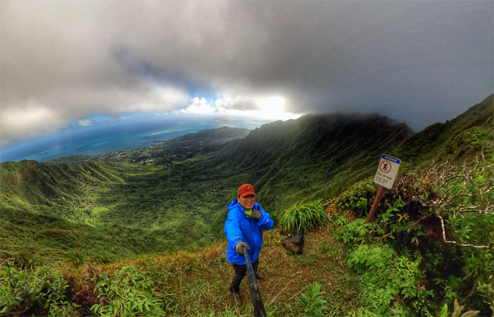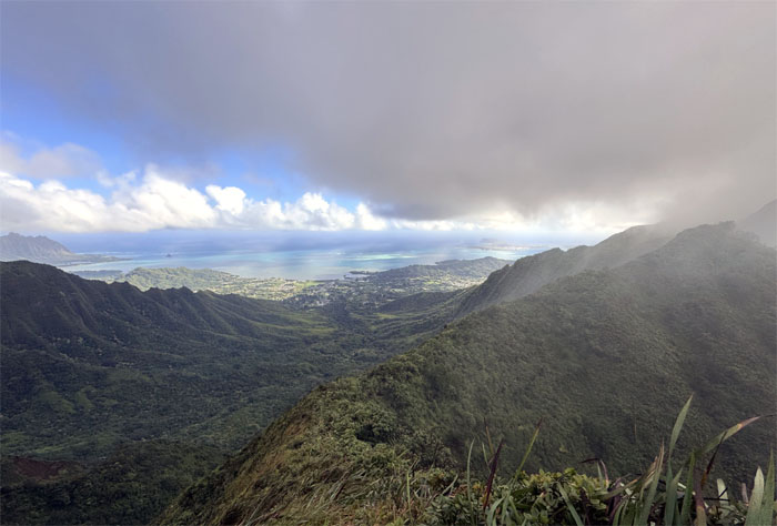 Photo of myself with the background of Waihe’e Valley bordered between Kalahaku Teeth and Eleao Windward. I contemplated going down Waimano Trail as the mud soaked trail, intermittent rain showers and overgrowth from Manana was trying to tell me something. However, I had barely scratched the morning and was hard of hearing, so I decided to press forward on the trail.