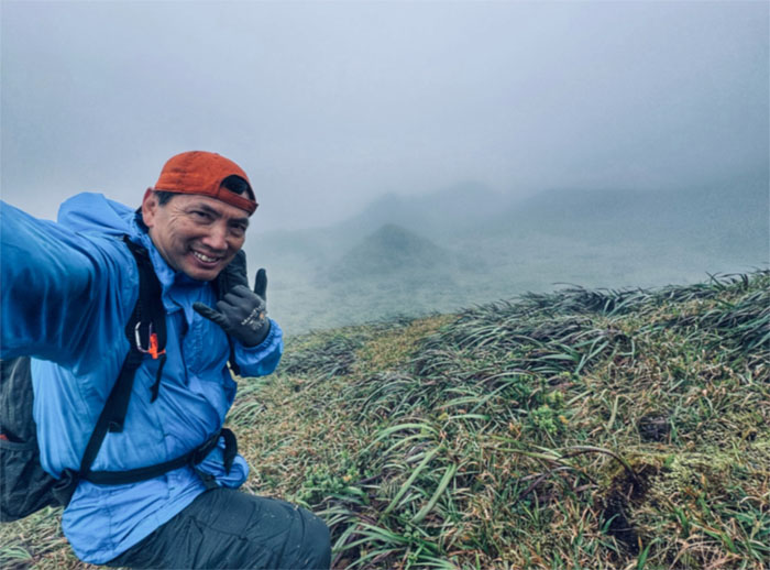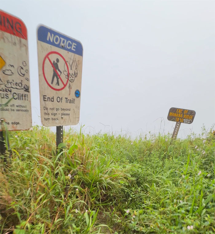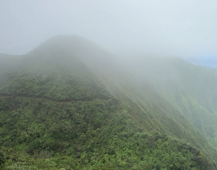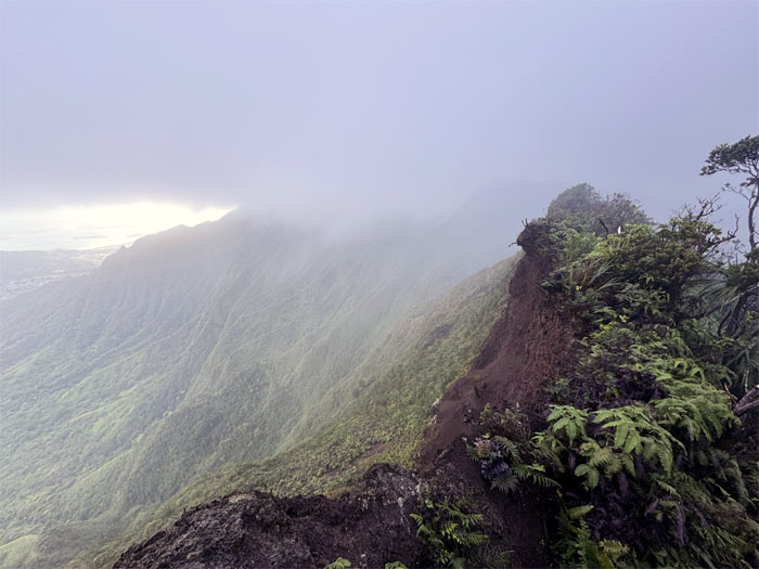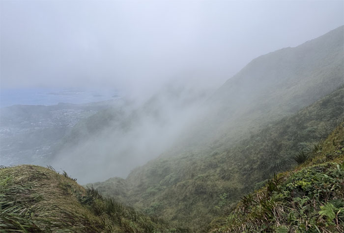 Arrived at the 2,660′ dew soaked summit to be met by a wall of whiteout. Expect nothing. Get nothing. Turned right on the spine of the Ko’olau Mountains to continue my hike in the clouds.