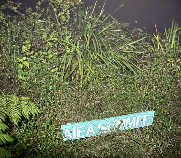 Passing the large landslide as I descended towards the saddle and the reflective sign that marked the 2,160′ summit of Waimano.