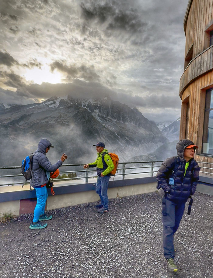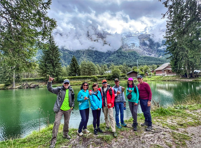 Group photo with the cloud cloaked Mount Blanc in the background.