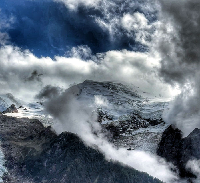 Looking up at the 15,766′ mountain that lays claim to being the highest peak in Europe and whose ownership is contested between France and Italy.