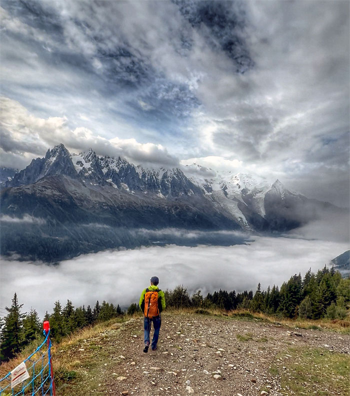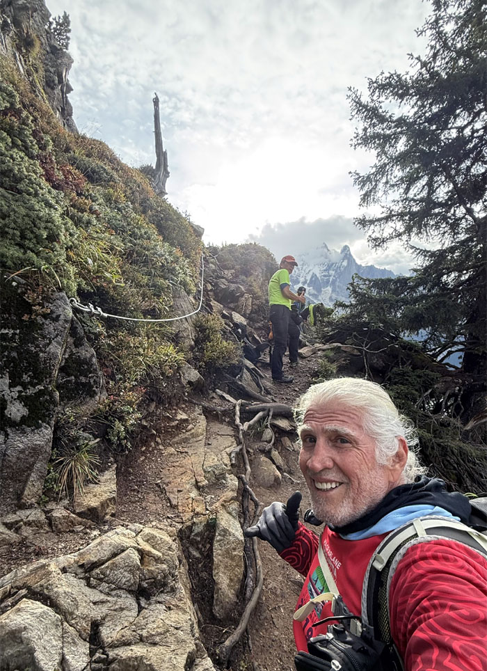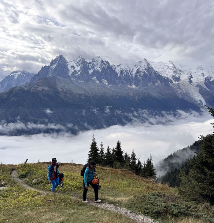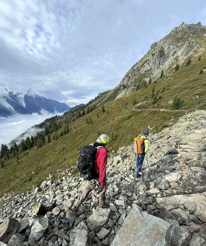 Going up the trail with the Mont Blanc massif mountain range behind us.