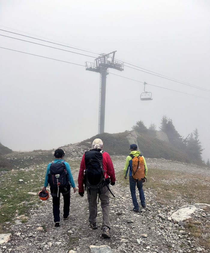 We are done, time to shed the helmets and harnesses. Just got to hike back to La Flegere and beat the rain.