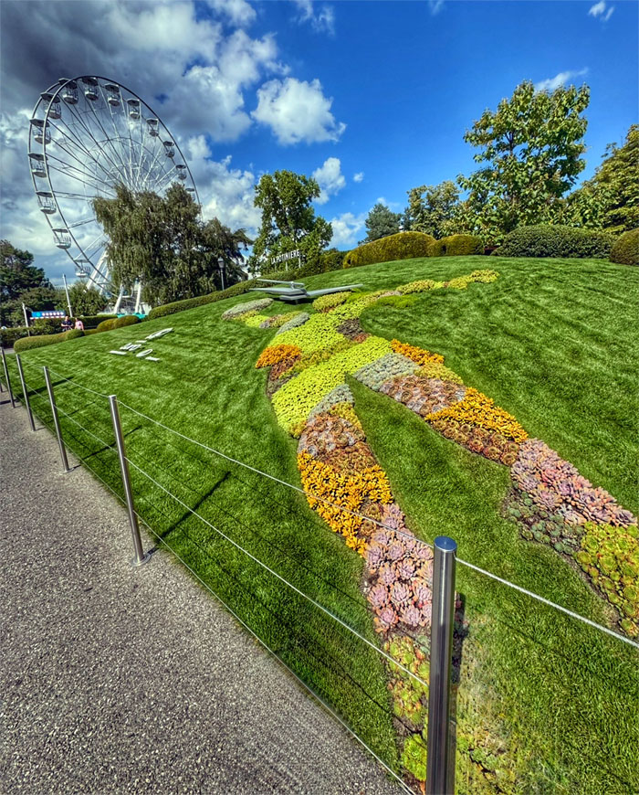 The flower clock that was created in 1955 as a homage to the city’s watchmakers that is made up of 6,500 flowers and plants as the Geneva Ferris Wheel rotated in the background.