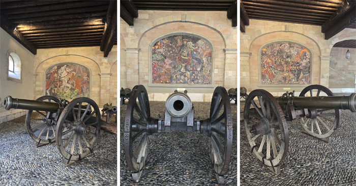 Three canons standing guard outside the 15th century armory.