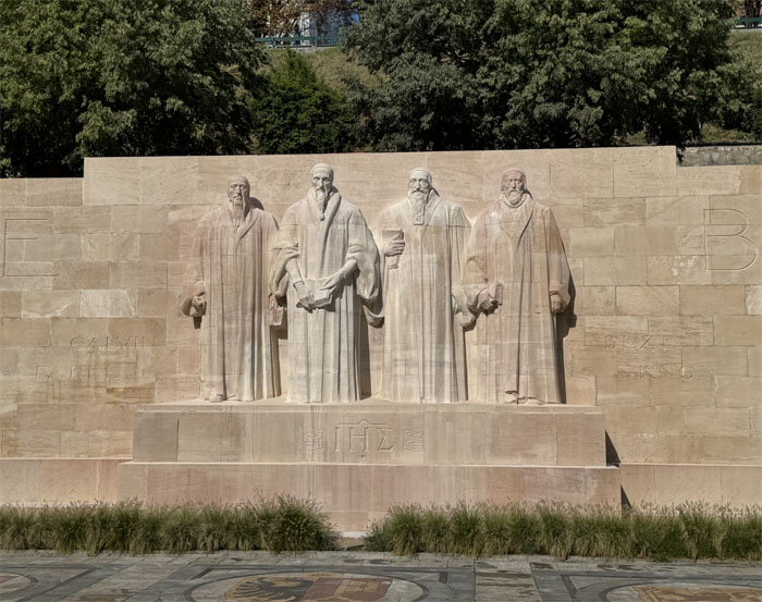 The monument located in the University of Geneva has four statues of men that were key proponents of Calvinism, the faith that believes God has predestined people who will be saved, rather than the Catholic Church who believes salvation lies in faith and good works.