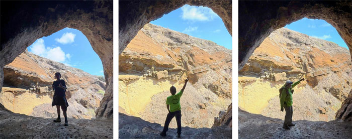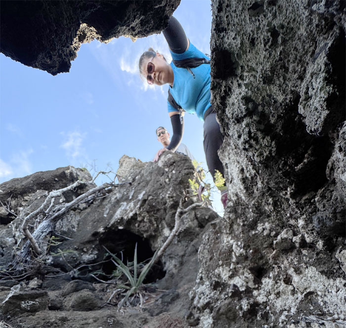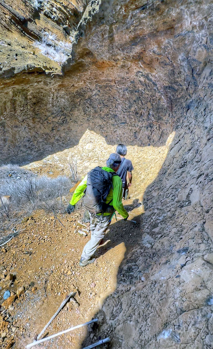 The terrain was uneven, loose rocks underfoot and annoying and irritating dry bushes blockading the way. Edgar and grandkids and Marilyn decided to turn around and call it a day. We traversed up and down multiple ridges before descending down to the cave.