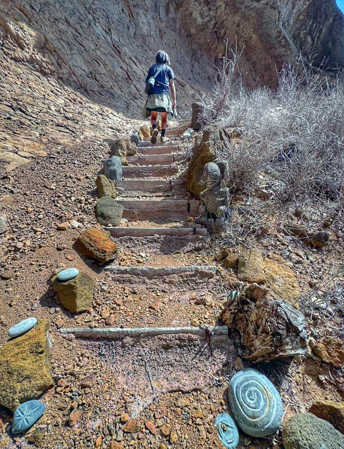 Going up the stairs to a shrine that has long been ransacked and wrecked, leaving only trinkets and scattered cow and goat bones.