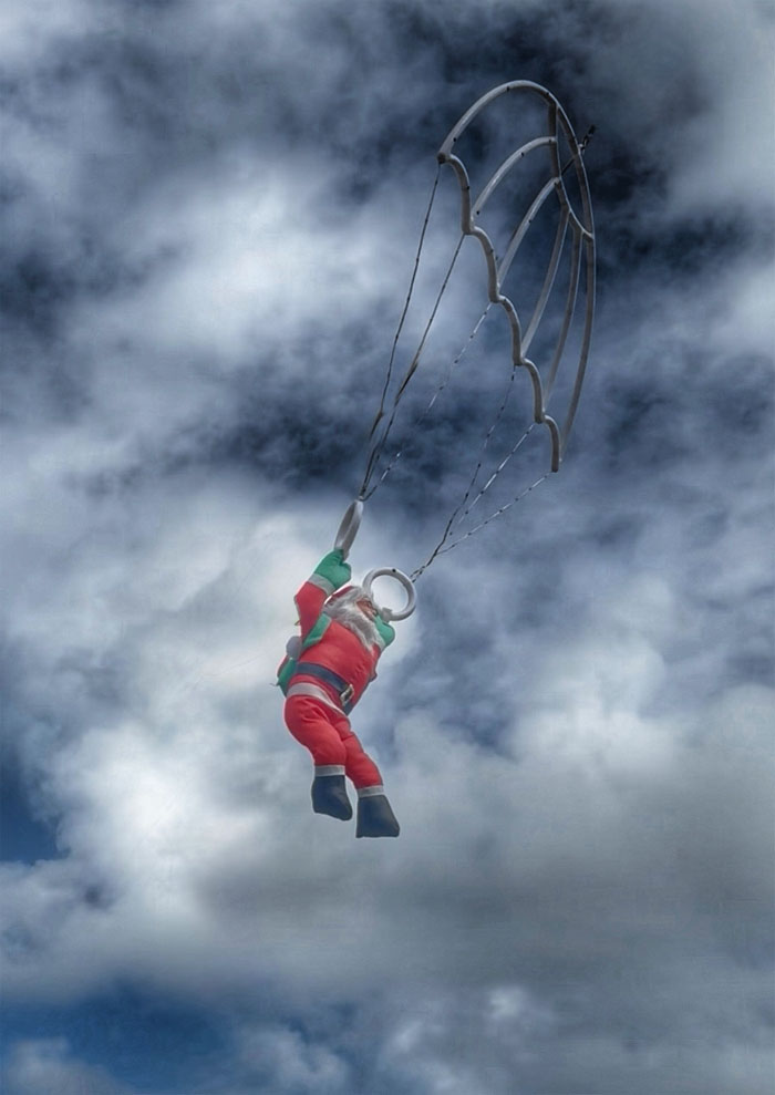Santa parachuting into the neighborhood to deliver presents to the nice kids. Naughty kids get a lump of clean, beautiful coal courtesy of Trump.