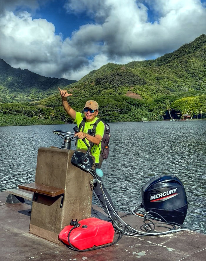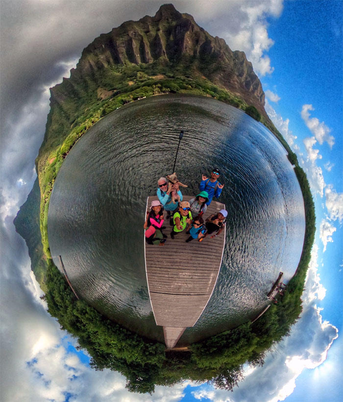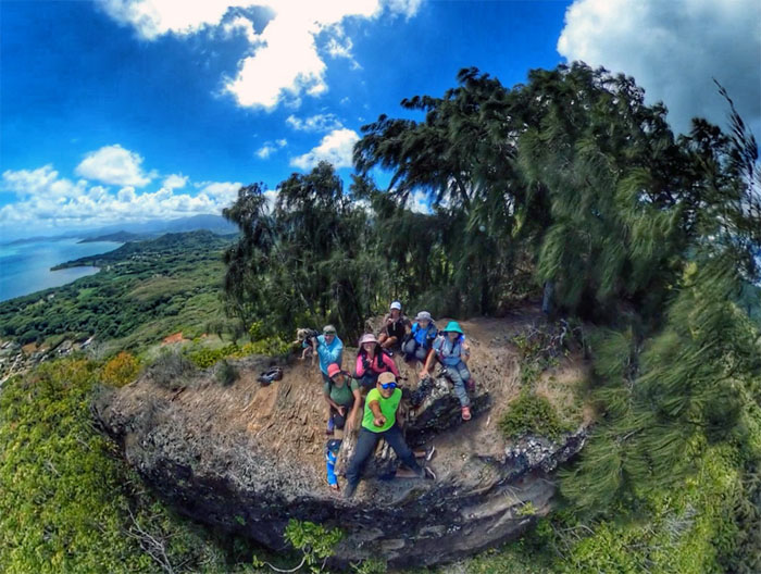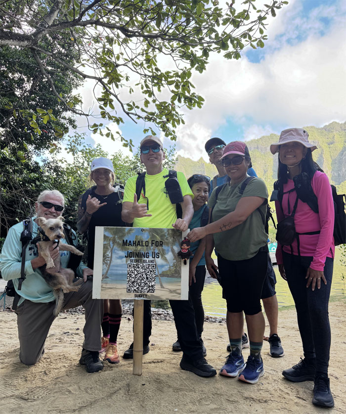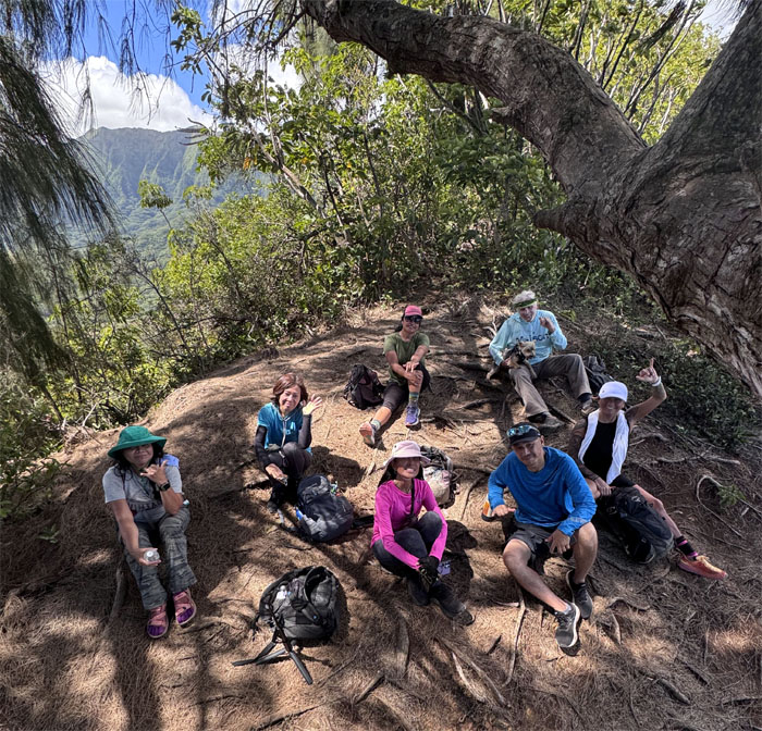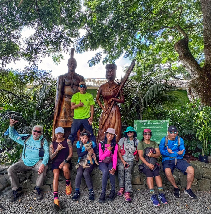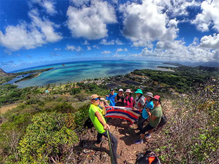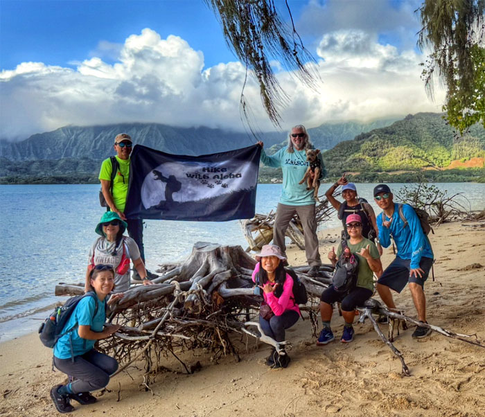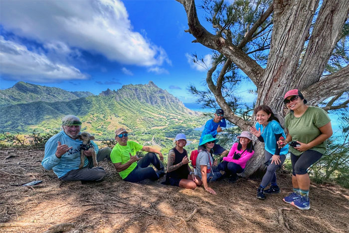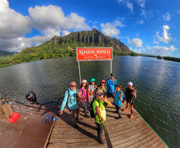 Group photo at one of the docks with Kualoa Mountain in the background.