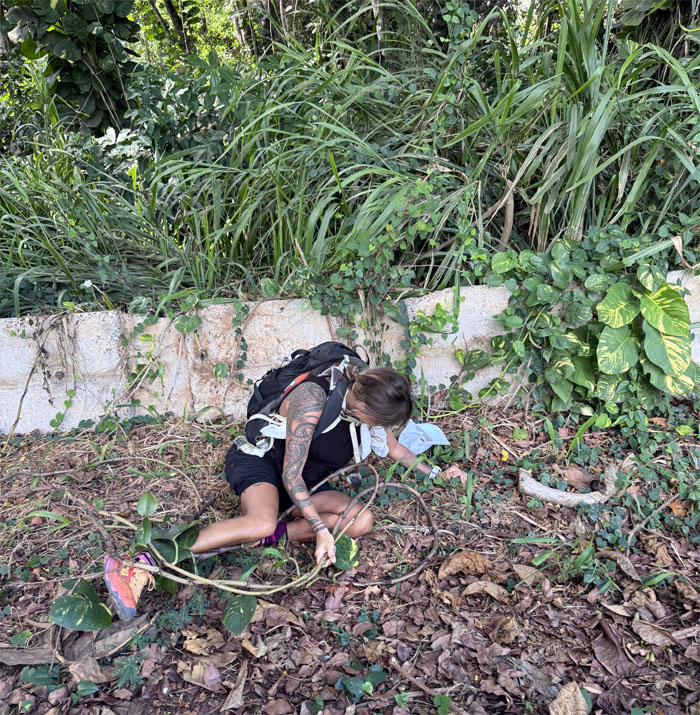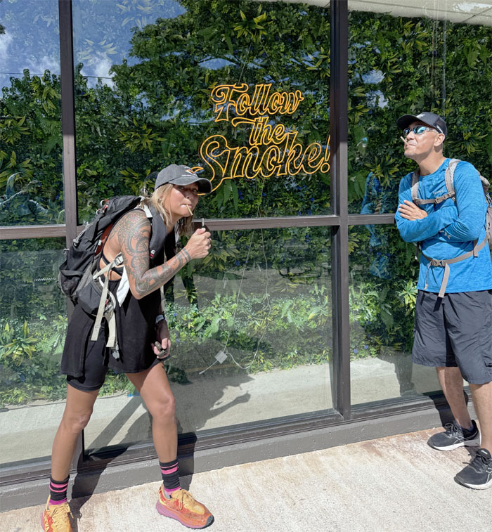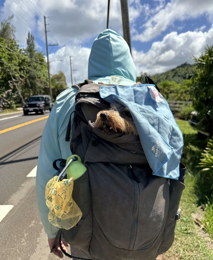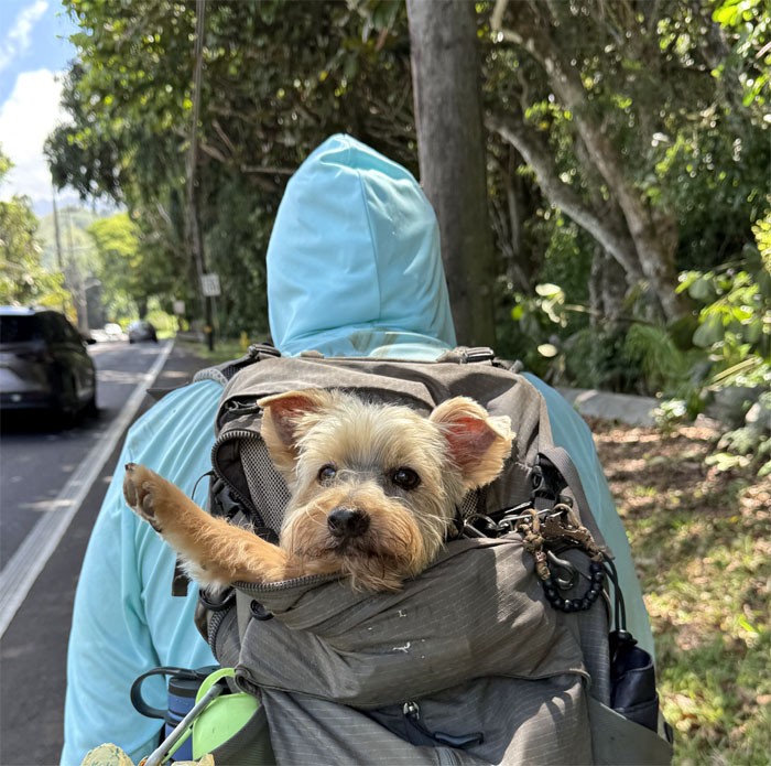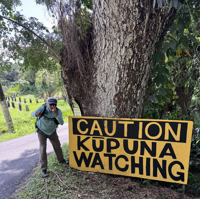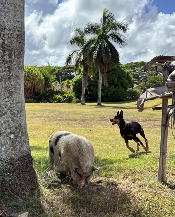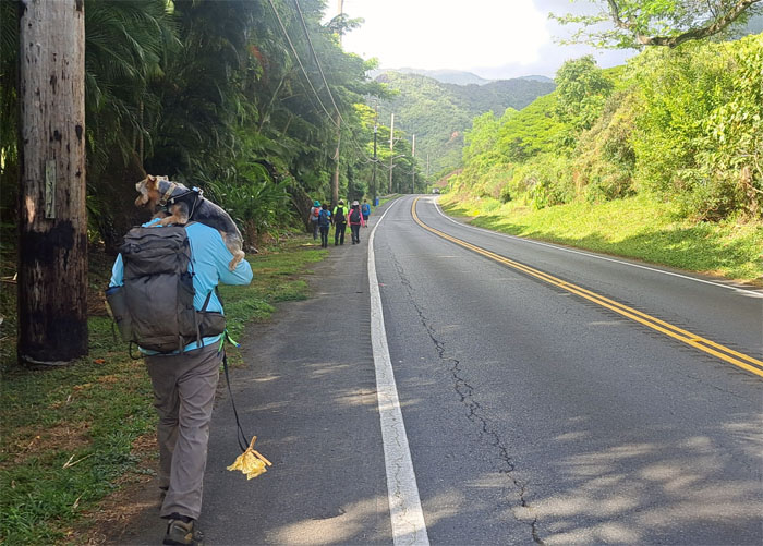 We turned off the highway to do a short and easy hike. Those words will come back to haunt me. Saw a hapai (pregnant) pig with her own guard dog. Nobody is messing with this pua’a (pig).