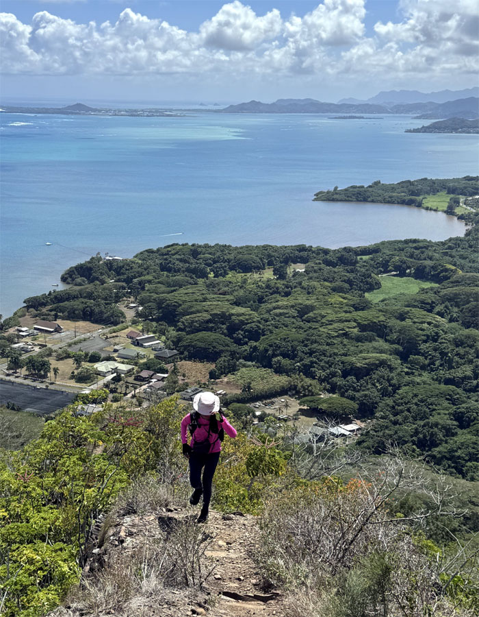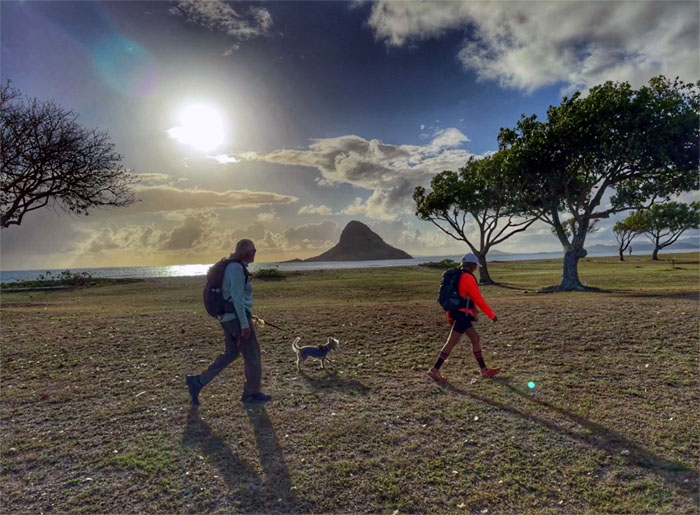 Walking on the beach with the islet of Mokoli’i in the background. The island used to be part of Kualoa Ranch as it was purchased in 1850 from King Kamehameha III for $1,300.00 ($53,996.00 today). It was purchased by the City in the 1970s.