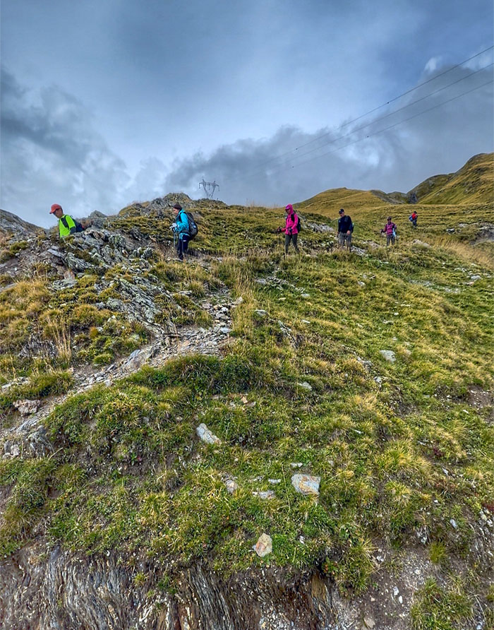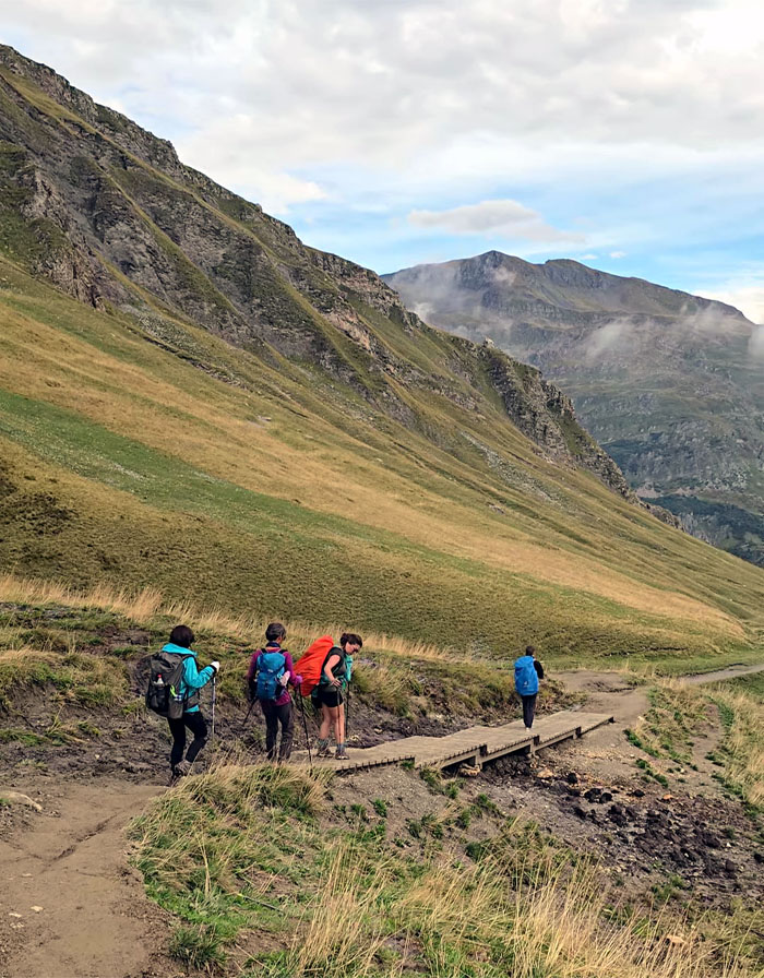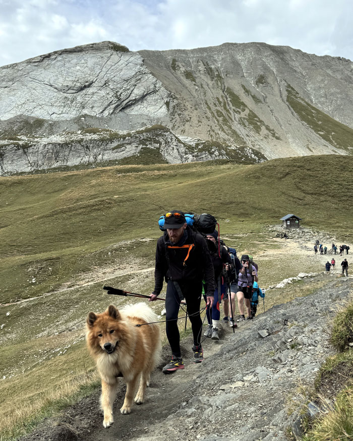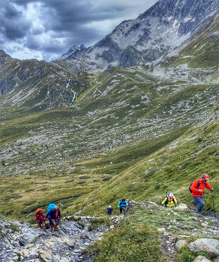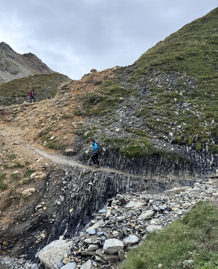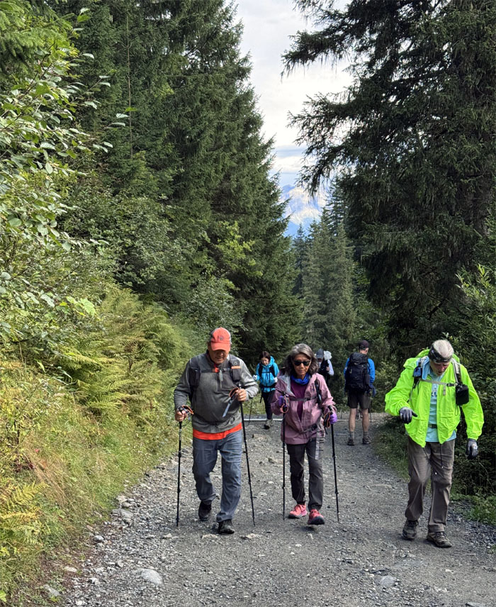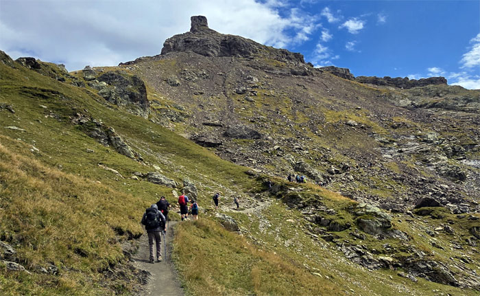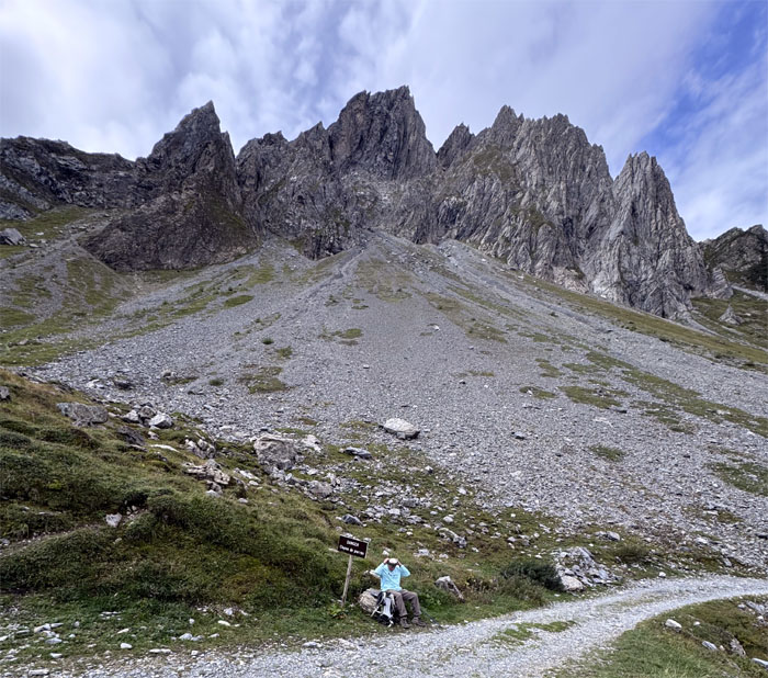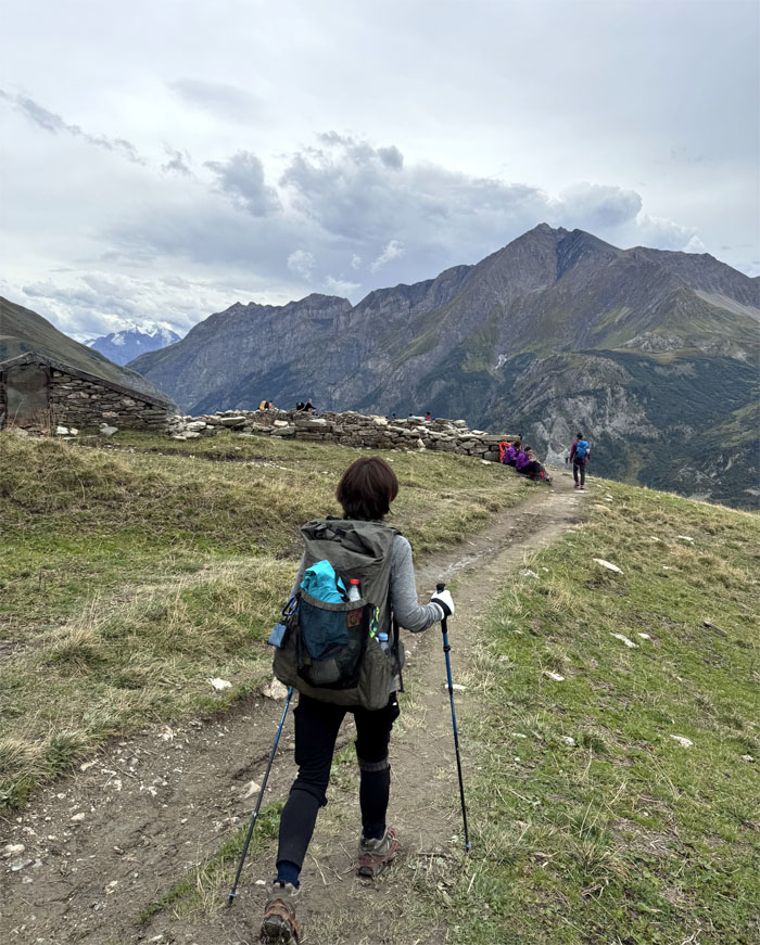 Headed up the trail with the 8,818′ summit of Aiguilles de la Penaz to our right.
