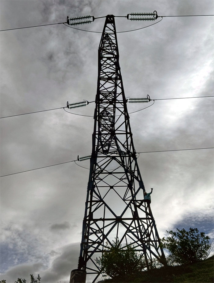 We waited for the rest of the group to catch up, so Chico decided to climb the nearby power line tower. There were no trees around to climb, so he had to make do with what he had.