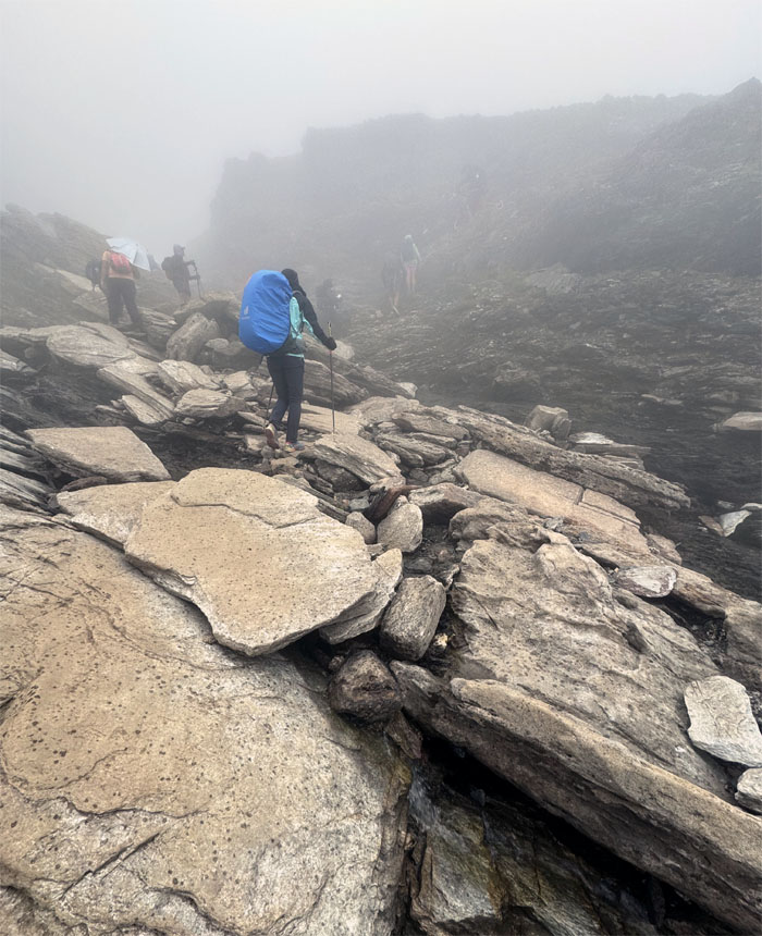 Technical as in uneven terrain and wayfinding. Throw in a little rain for good measure. Sylvia directed some other hikers on the correct path as they were about to go “exploring.”