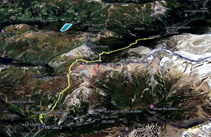 Our second day on the Tour du Mont Blanc trail covered 10.33 miles through more beautiful scenery and terrain. Somebody else wanted to take a zero day on the third day. Is this catching? Economic and language motivation won out again.