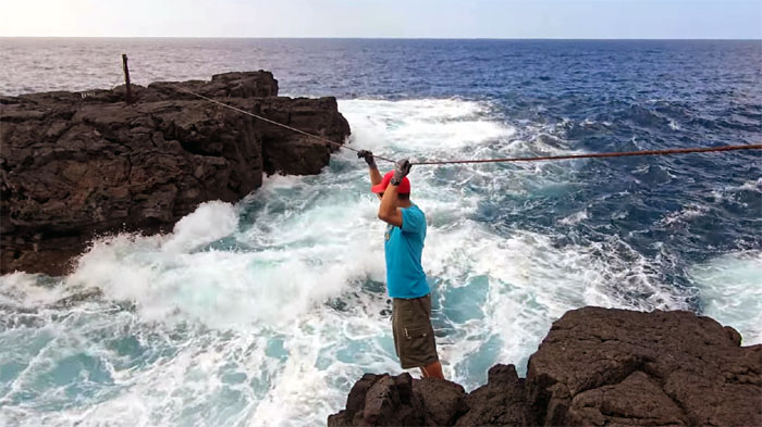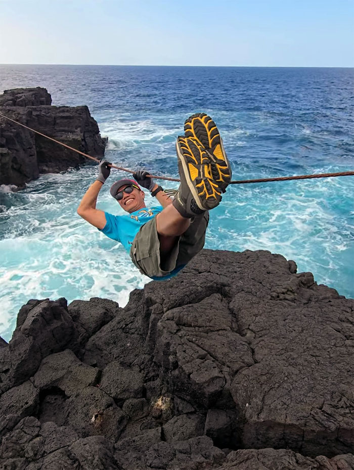 Ferlino demonstrating the safer practice of hanging over terra firma.