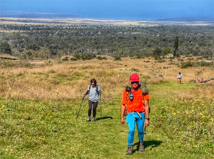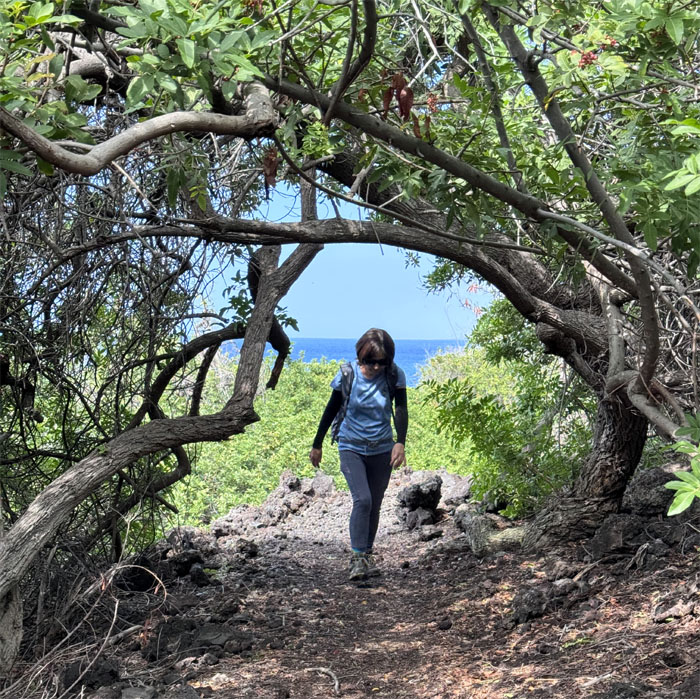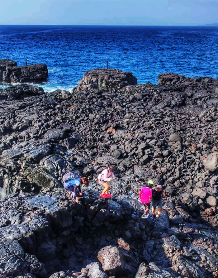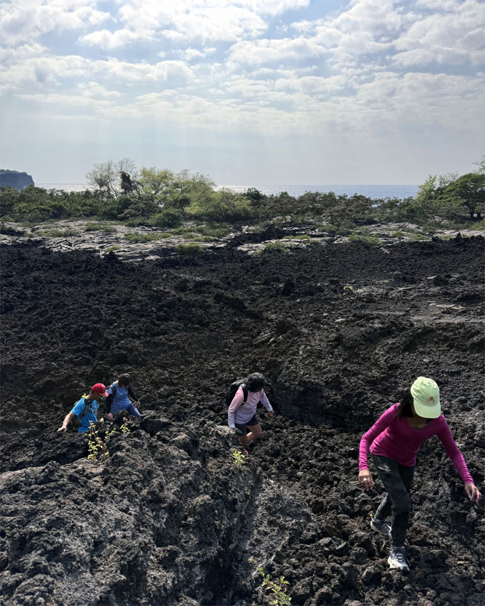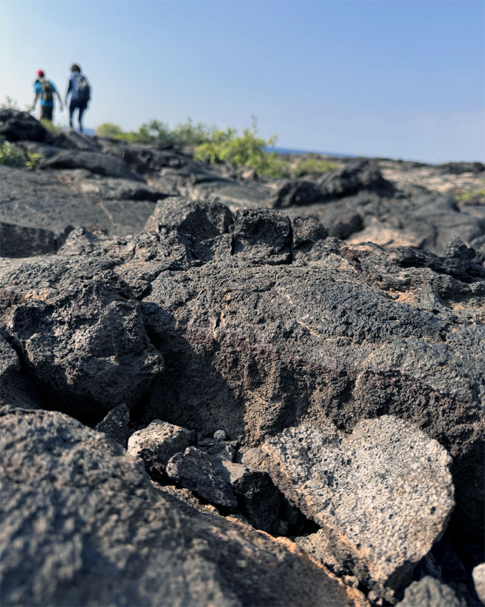 Roger and Aida using the stepping stones over the chunky and crunchy ‘a’a lava. Ow! Ow!