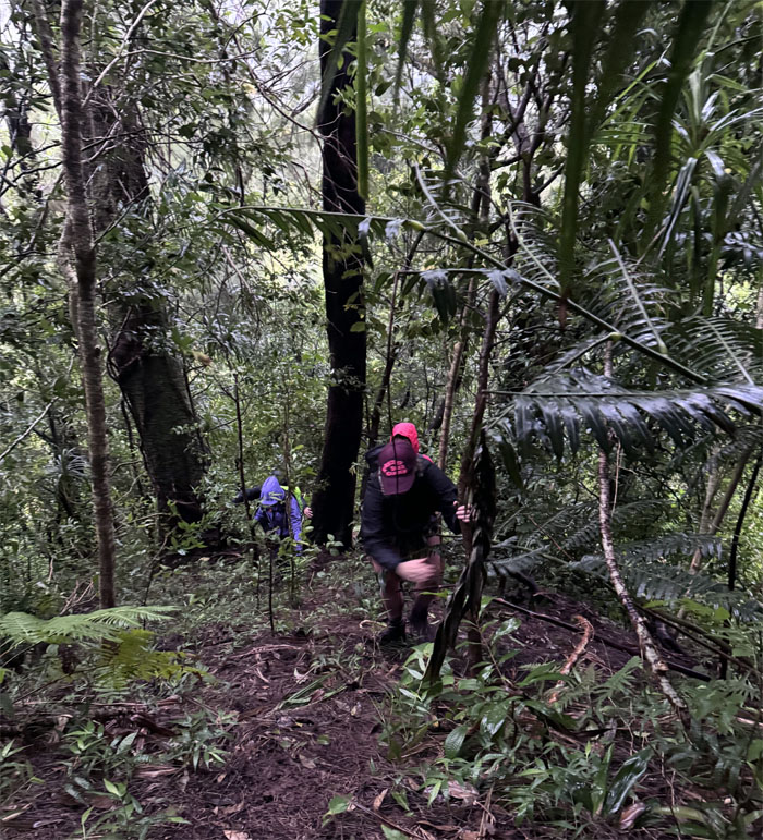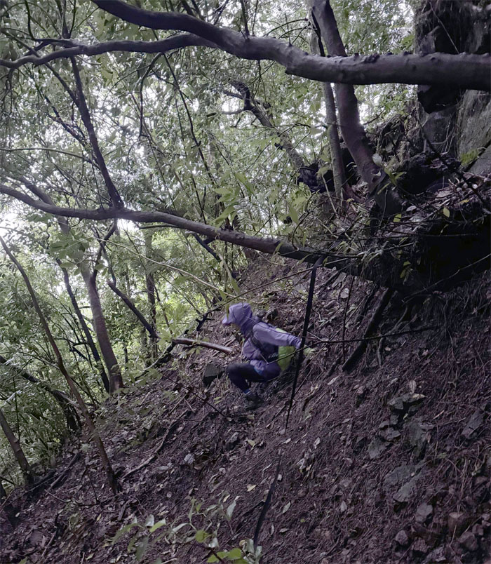 Leaving our precarious perch on the hill as we scrambled our way back down the soft and slippery slope.