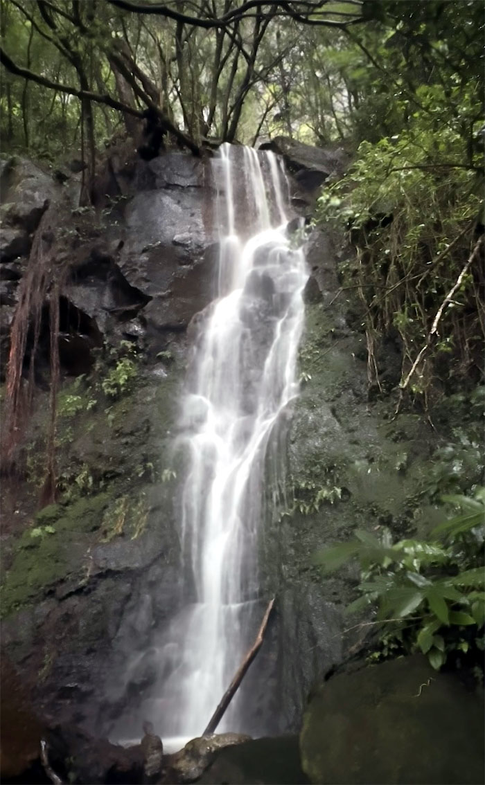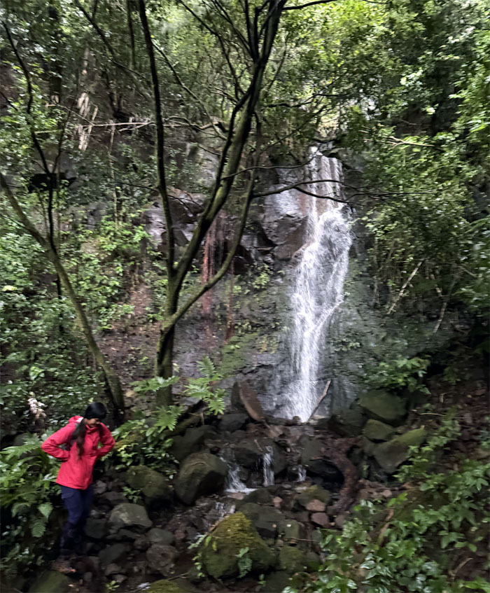 Val looking up at the waterfall. There was probably a third tier, but no discernible means of approach. Plus, we were getting cold. Hawaii people and all.