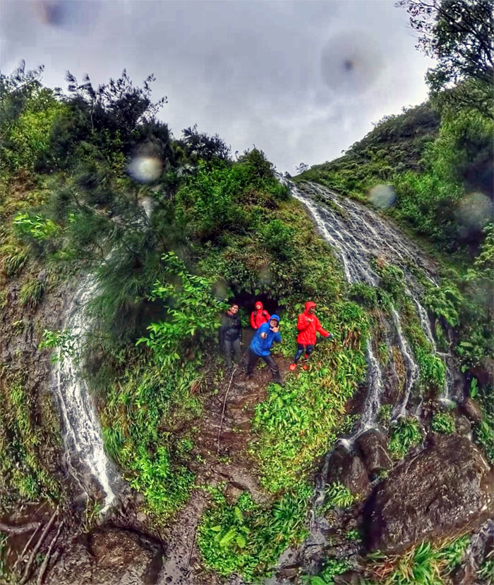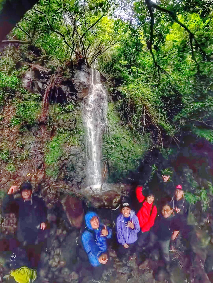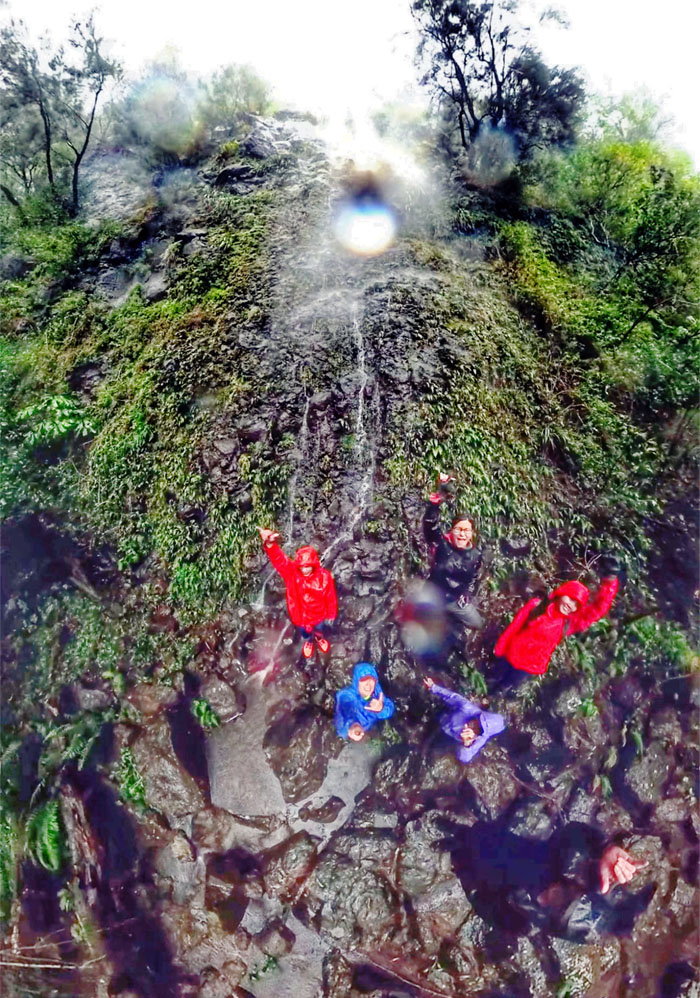 Group photo from the cave between the twin waterfalls.