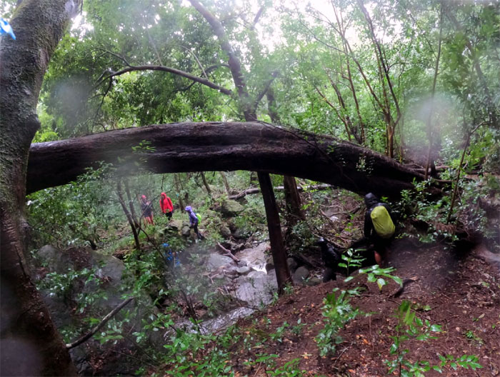 Passing underneath a fallen tree which answers the philosophical question. If a tree falls in a forest, just make sure you get the hell out of the way.