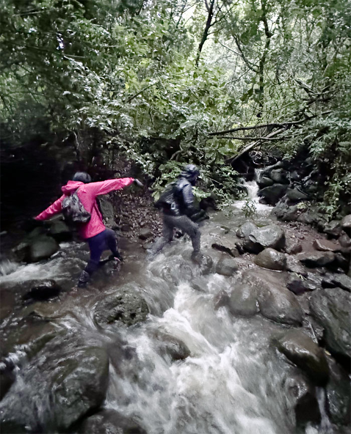 Passing over one of multiple swollen streams in the valley.
