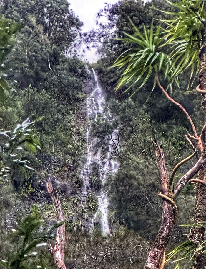 Looking up at the second tier as the winds were whipping something fierce and were flying most of the water into the air, rendering the waterfalls less voluminous in appearance.